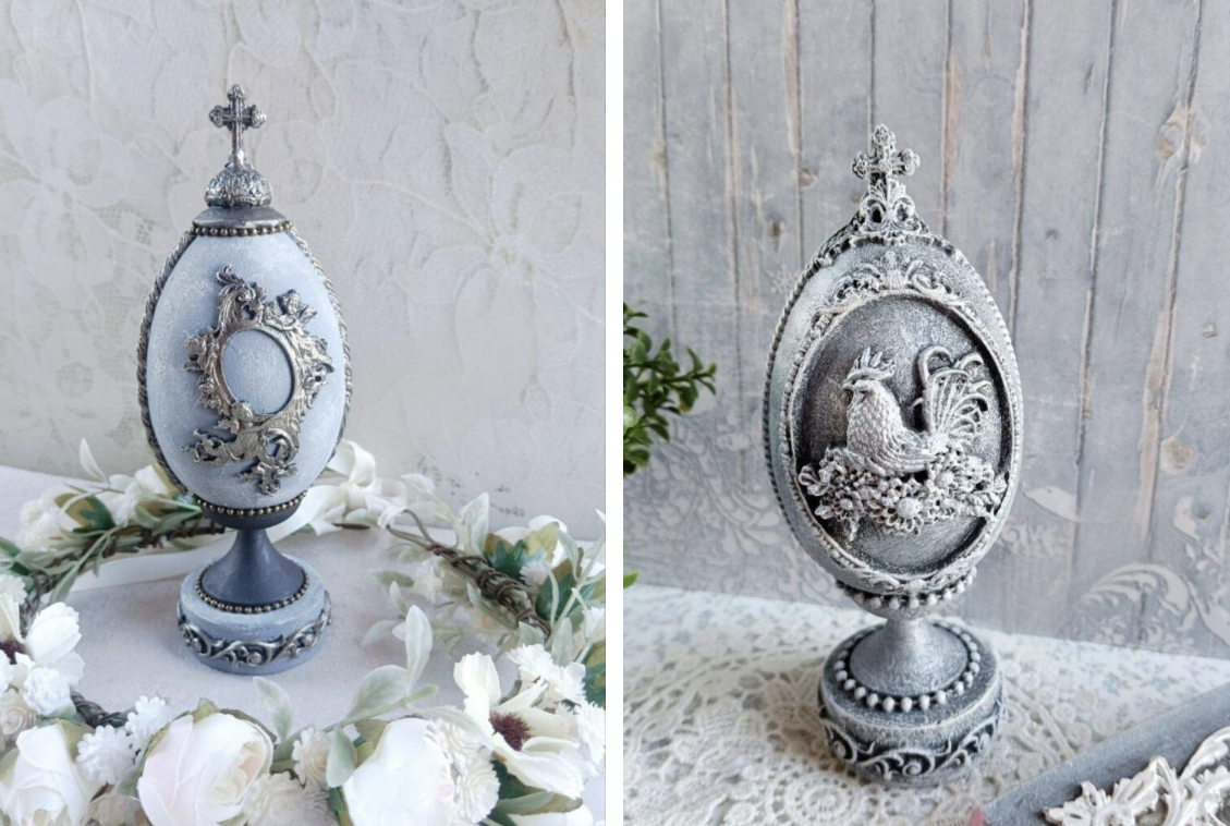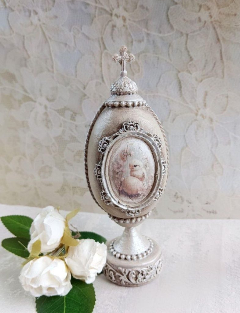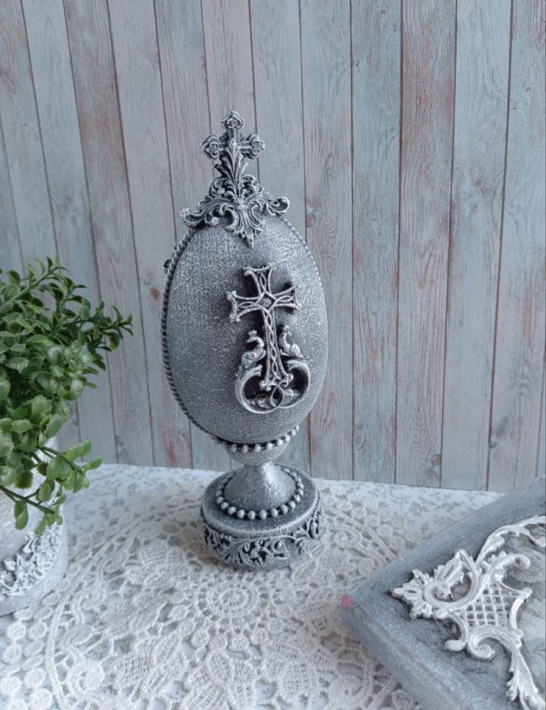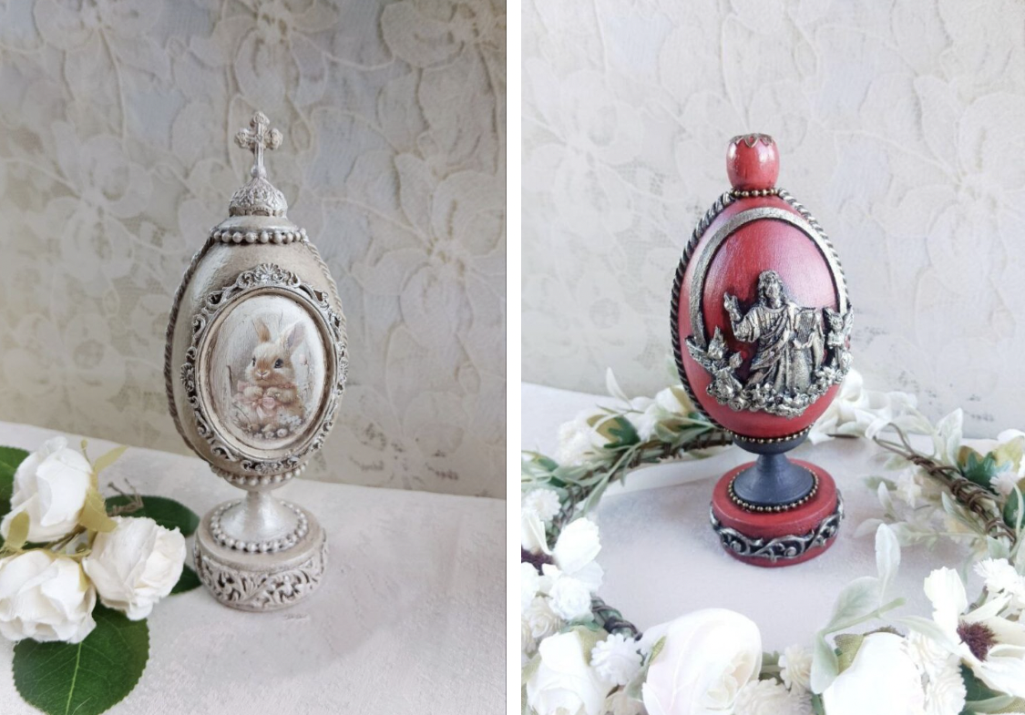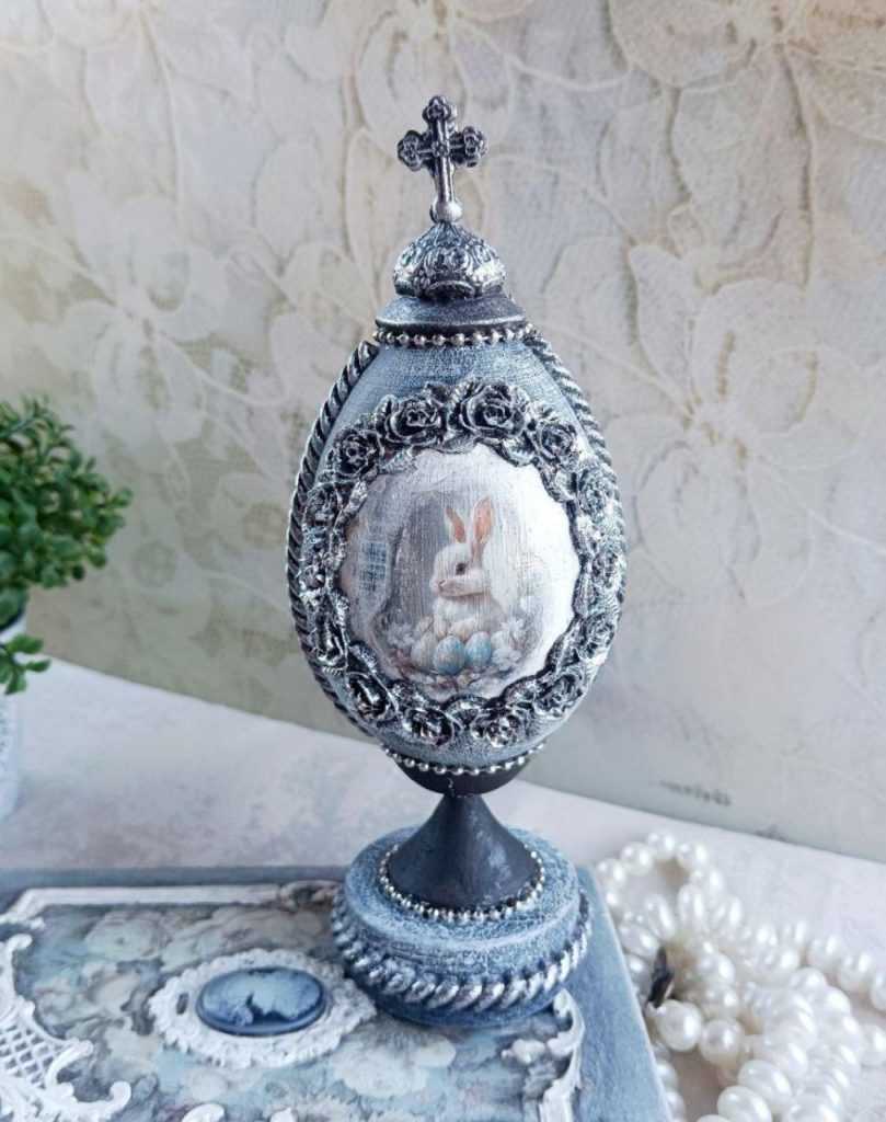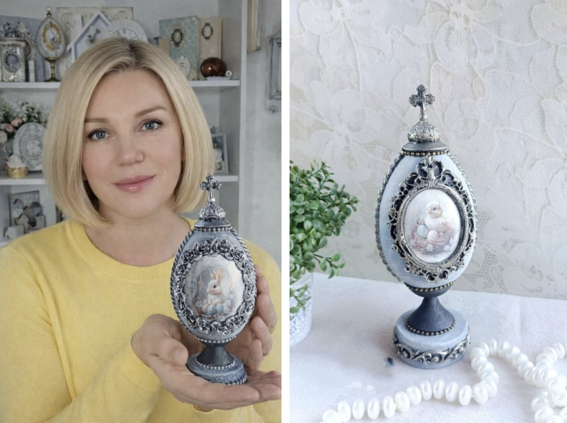 «Я спершу уявляю, якою має бути писанка. Думаю, який буде фон, який малюнок, які декоративні елементи підійдуть. Інколи навіть відкладаю роботу на день-два, щоб остаточно зрозуміти, як вона має виглядати. Спочатку заготовку потрібно підготувати: відшліфувати, заґрунтувати і пофарбувати у потрібний колір. Далі починається робота у техніці декупажу. На поверхню акуратно переносять спеціальні зображення. Це можуть бути великодні сюжети, кролики, квіти, орнаменти або ніжні весняні композиції, – переконує закарпатка. – Після цього додаю об’ємні декоративні елементи. Саме вони створюють той ефект розкоші, який асоціюється зі стилем Фаберже. На писанках з’являються металеві рамки, декоративні орнаменти, перлини, намистини, рельєфні візерунки та інші прикраси».