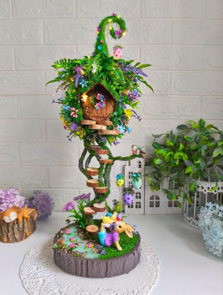 «Це було так ніжно, так по-весняному! Гілки ніби ожили. Тоді я зрозуміла, що можу зробити з цього щось більше, – пригадує майстриня. – Почала шукати інформацію в інтернеті, пройшла декілька онлайн майстер-класів і почала експериментувати. Відтоді щовесни у моєму домі «розквітає» одразу кілька дерев. Одні – у пастельних тонах, інші – яскравіші, з акцентами на жовтий чи рожевий. У роботі поєдную текстильні квіти з гіпсовими фігурками, додаю пінопластові яйця, обтягнуті тканиною, або писанки інших майстринь, прикрашаю композиції дрібними деталями з дерева чи пластику. Я люблю мікс матеріалів. Головне, щоб усе мало гармонійний вигляд. Навіть пластик може виглядати дуже ніжно, якщо правильно його подати», – впевнена умілиця.