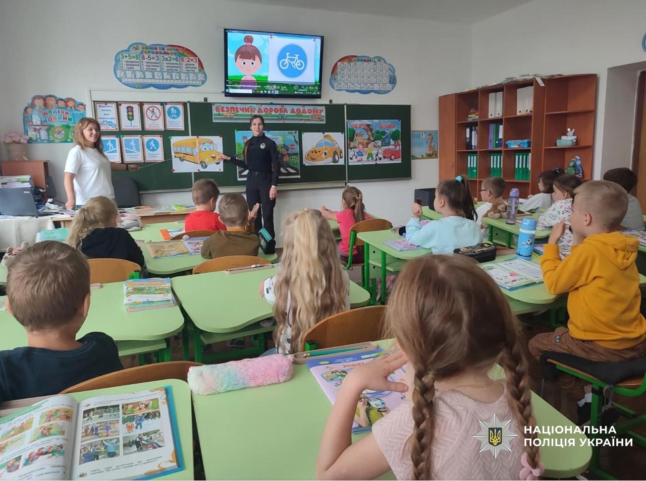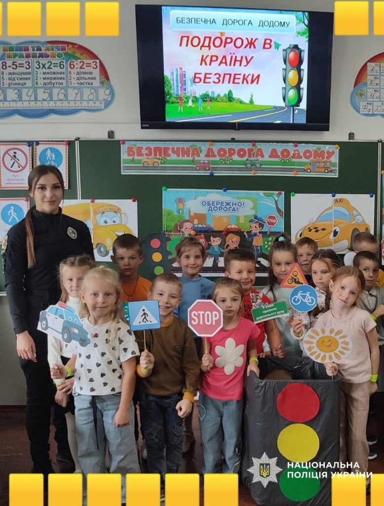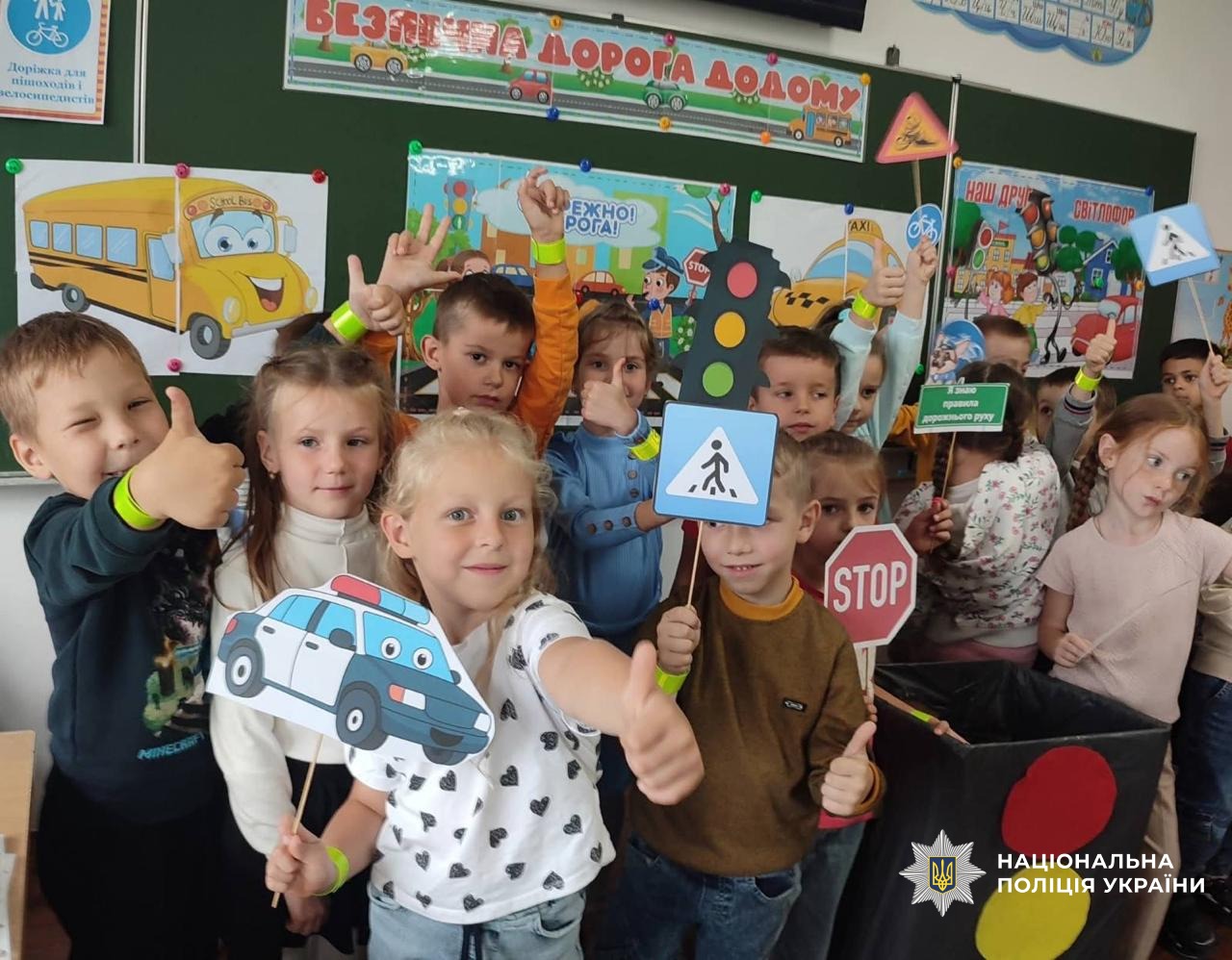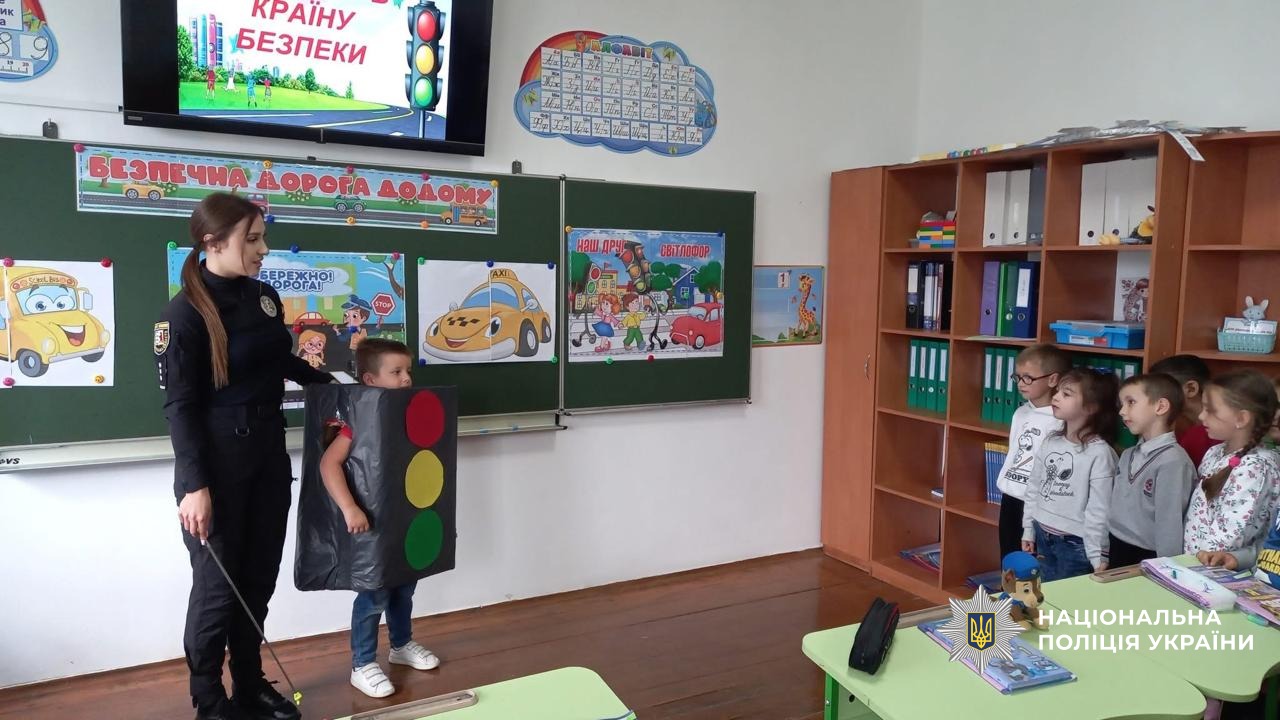 Щоб закріпити знання школярів правоохоронниця запросила їх взяти участь у грі «Світлофор». Під час інтерактивного завдання діти вчилися орієнтуватися на сигнали світлофора та повторювали основні дорожні правила.
