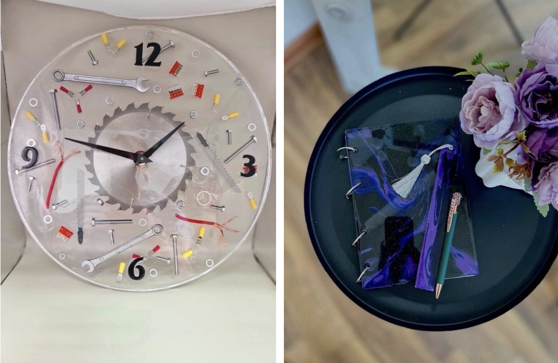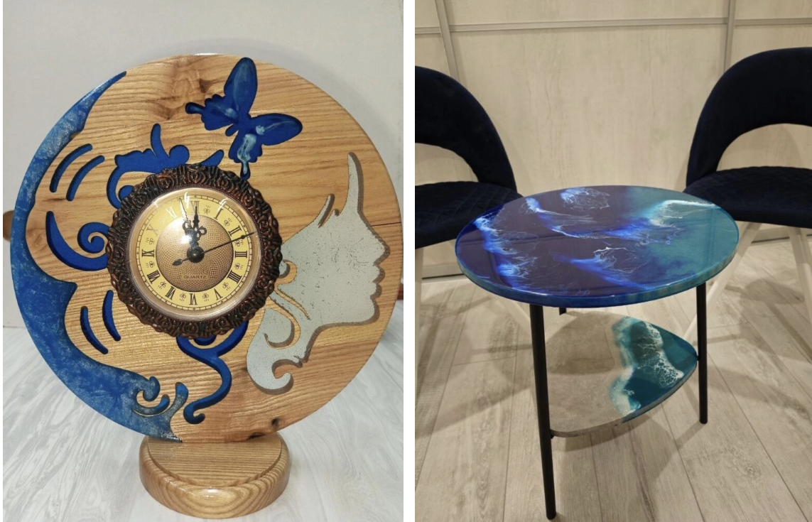 «Найбільше у мене сувенірів, предметів побуту. Роблю навіть посуд. Він напівпрозорий і дуже цікавий. Крім того, маю в доробку і прикраси. Пробувала створювати картини, годинники. Але особливо мене тішать меблі. Передусім – столи. В нашому будинку вже 4 столи мають епоксидну поверхню і авторську оздобу. Також покриваю смолою полиці, стільці, лавки, тумби. Роблю усілякі підноси, підставки для телефонів, органайзери. Влітку багато квітів, рослинності. Якщо їх «обгорнути» у оболонку зі смоли, вони можуть стати унікальним доповненням для будь-якої деталі інтер’єру. Також люблю створювати підсвічники, рамки для фото, вази, підставки під чашки. До смоли, між іншим, можна додавати не тільки фарби та рослини, але й мушлі, камінці, блискітки, будь-що. Головне, аби це мало гарний гармонійний вигляд, аби деталі поєднувалися між собою», – зізнається вона.
