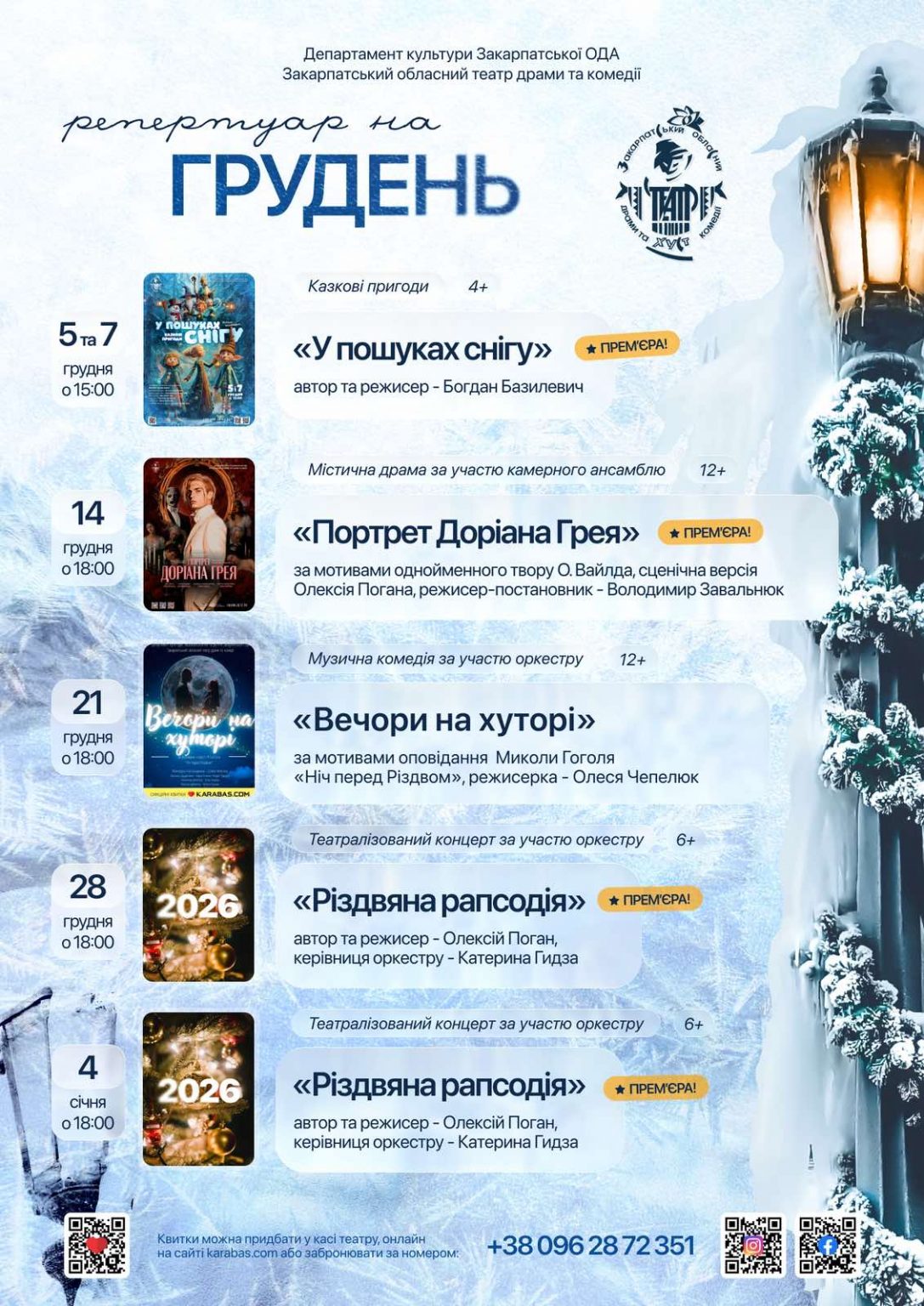 Крім того, наприкінці місяця театр представить іще одну постановку до зимових свят – театралізоване різдвяно-новорічне дійство «Різдвяна рапсодія» за участі оркестру (автор та режисер – Олексій Поган). Прем’єра відбудеться 28 грудня о 18:00.