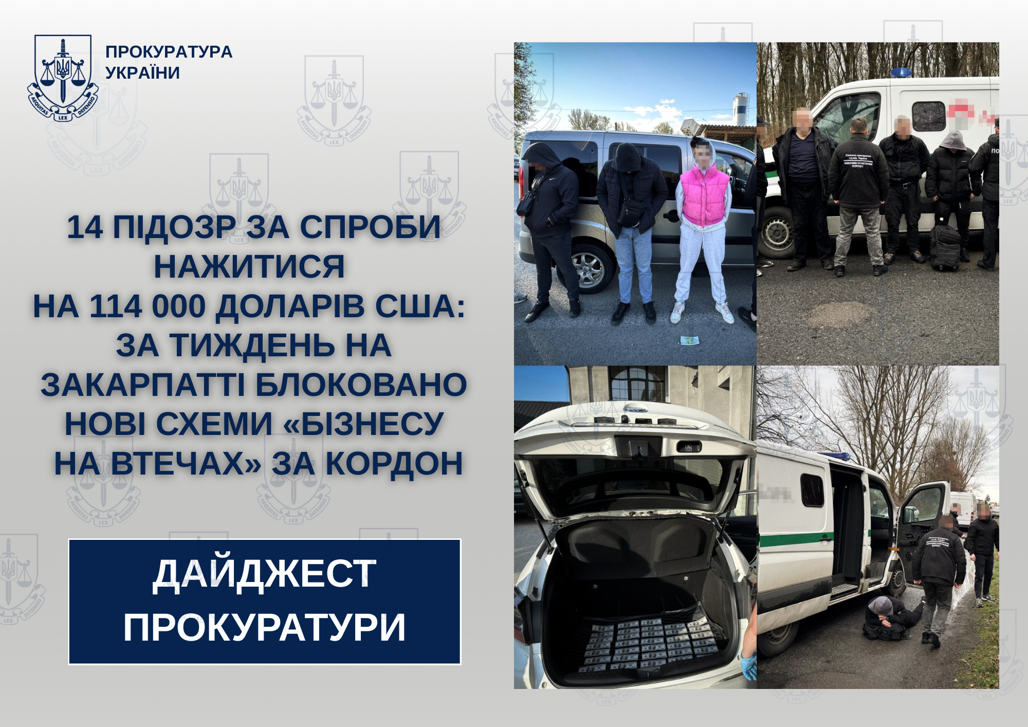 На Берегівщині затримано двох інкасаторів та їх керівника зі Львівщини, які у броньованому авто доставляли чоловіків до прикордоння. Загальна вартість поїздки — 16,5 тисячі доларів США. Щоб уникнути блокпостів, вони вмикали проблискові маячки та змушували клієнтів ховатися у спеціальному відсіку. У іншій схемі викритій на Берегівщині мешканці с. Довге Закарпатської області та м. Рівне намагалися незаконно втекти за 19 500 доларів США.