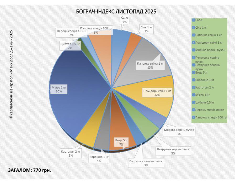 Відповідно до «індексу бограча» якщо за жовтень 2025 року на родину з п’яти людей потрібно було витратити 684 гривень, то у листопаді 2025 року різниця цін склала 86 гривень – і загальна вартість продукції за «Бограч-index» – 770 грн, тобто зміна цін відбулася на 12,5%.