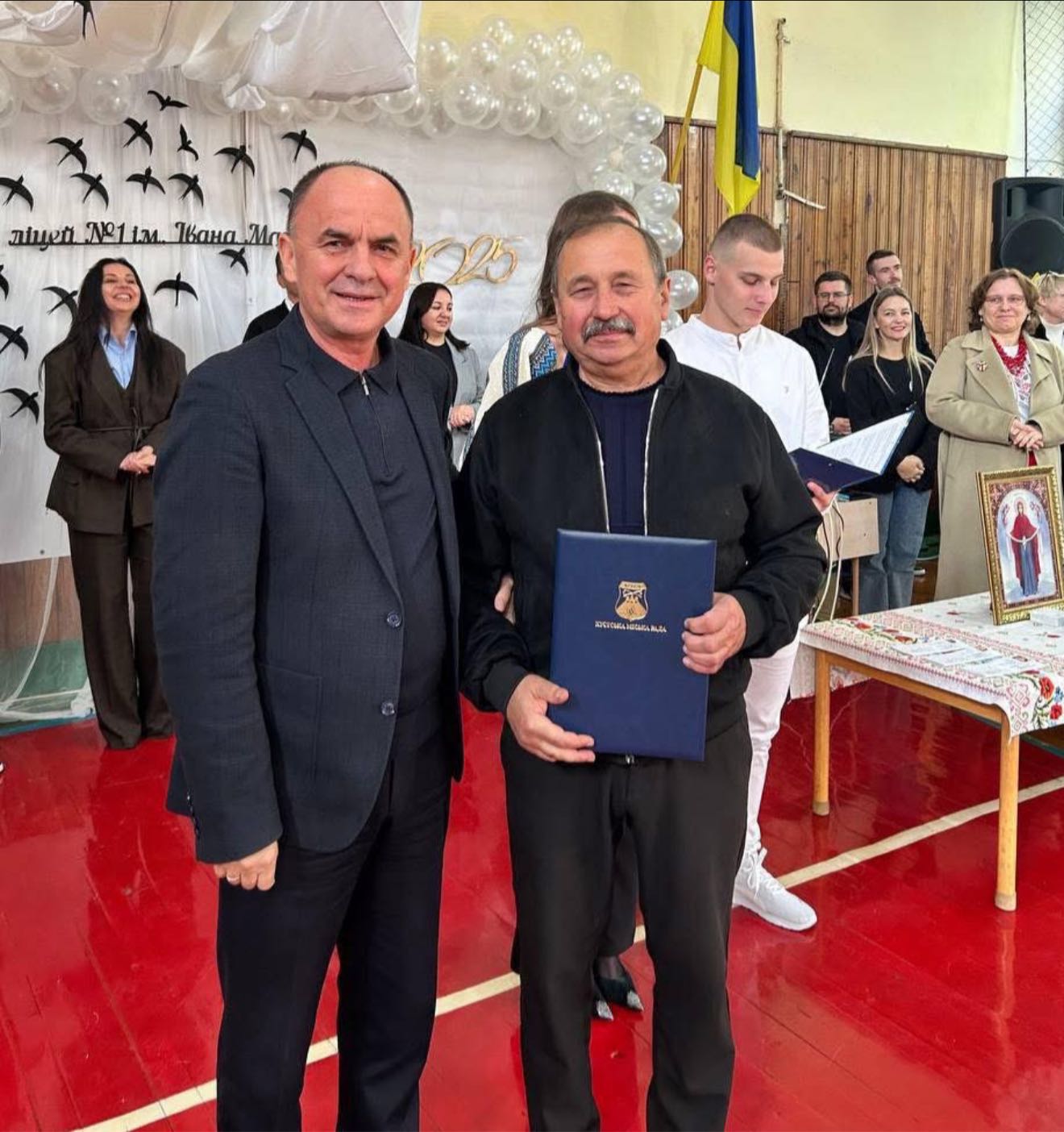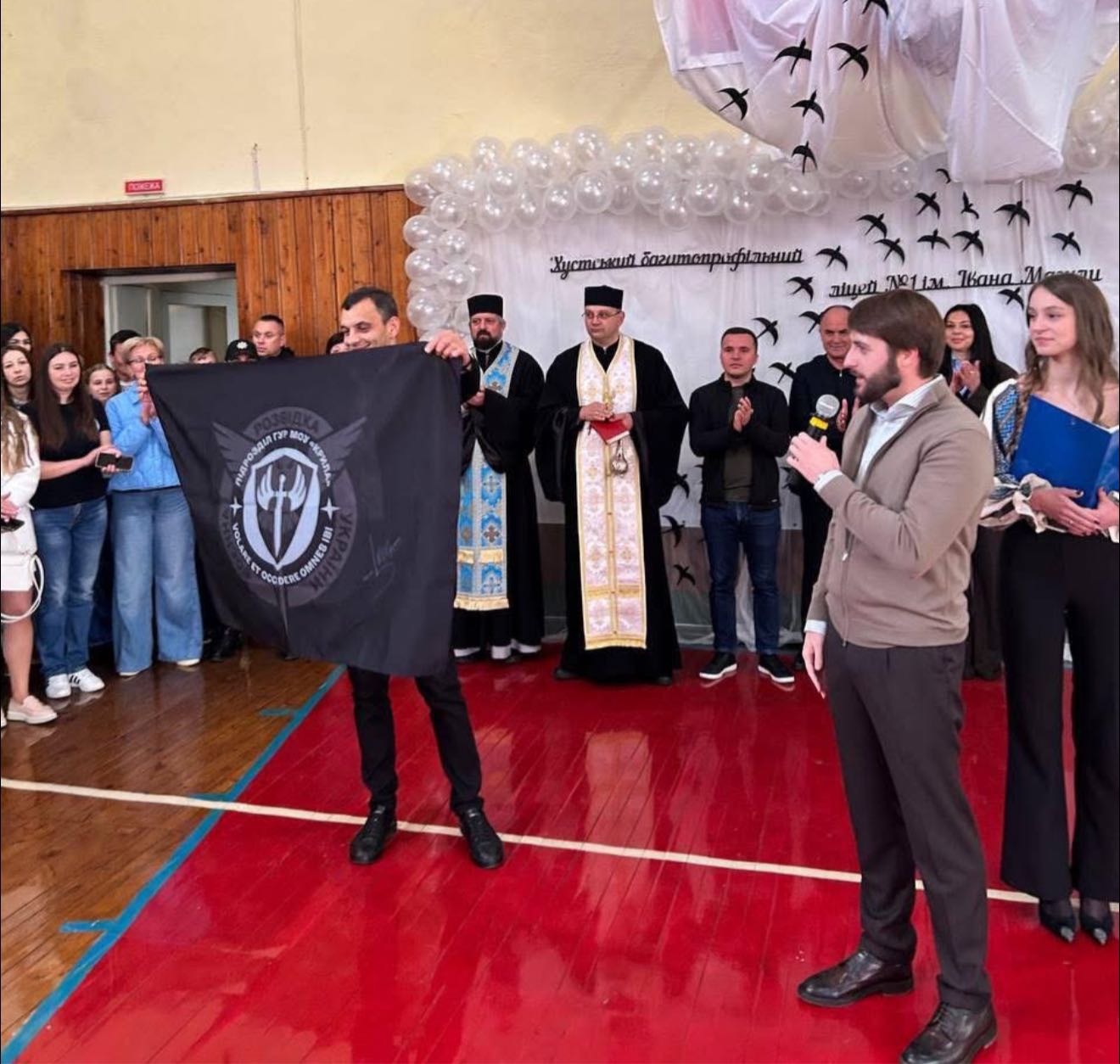 Дмитро Білецький передав до ліцею стяг ГУР МО України з підписом начальника розвідки генерала Кирила Буданова. «Впевнений, він стане символічним експонатом, який надихатиме майбутні покоління на любов до України та вірність її захисникам», – наголосив депутат Хустської міської ради.