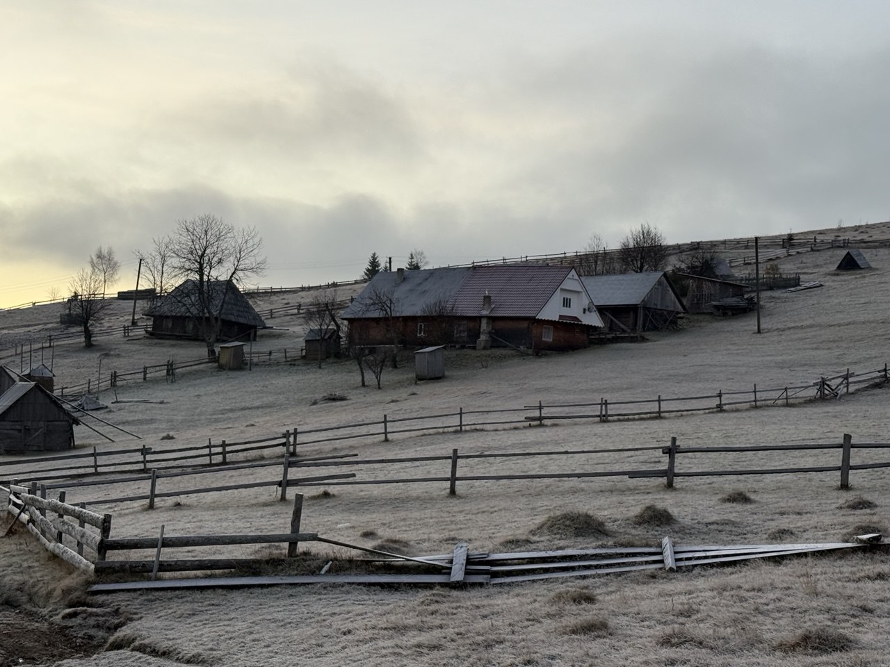 На тому наш small talk завершуємо. Ми виходимо до потічка з містком. Починається село. Краєвиди тим часом змінюються, світлішає. Відкривається небо неймовірного забарвлення: світло -сіро- рожеве з серпанком. Дорога рівнішає, багнюка зникає. Картинку доповнюють рештки квітучих кущів вкритих інієм біля парканів. Рівно 8.00. У дорозі ми вже 40 хв. З дворів через один виходять діти, поспішають до школи. Марійка з Іванкою затримують біля одного будиночку. Чекають подружку.