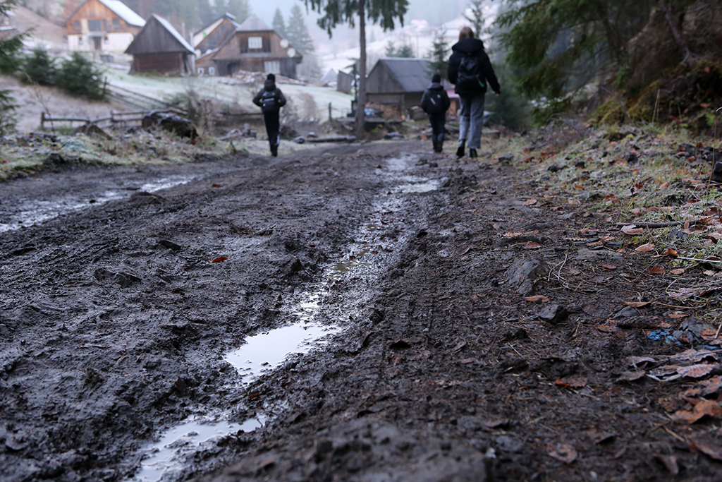 Діти більш прагматичні і мають чітку ціль – до школи. Стандартний маршрут не для замилування. І треба прийти з чистим взуттям. Місцеві жителі періодично намагаються звернути увагу на стан дороги й те, що тут не просто лісівники ходять та дикі звірі, але і люди високо в горах живуть. Марічка, до речі, навіть писала листа-звернення до нардепа Миколи Тищенка за часів його вояжів з перевірками лісового господарства. Дорогу трохи підсипали щебнем, почали щось було робити і все затихло.