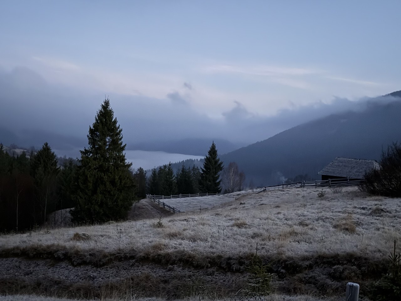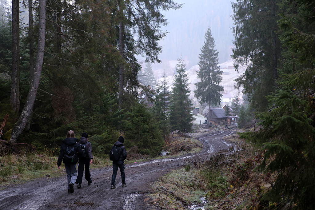 Марічка, Іванка та Василь швидко йдуть дорогою від хати, примерзла земля цього разу – додатковий бонус. Ще трохи набираємо висоту, а потім пірнаємо у ліс. Тут вже тепліше і відповідно болотяніше. Зате своя краса: смереки, м’який килим з моху та хвої, якщо заглибитися у хащі. Я біжу за дітьми, притримуючи фотоапарат і намагаючись хоч якось їх наздогнати, щоб поговорити. І одним оком зафіксувати ці кольори, а в пам’яті залишити хоч трохи відчуття якоїсь несподіваної пригоди