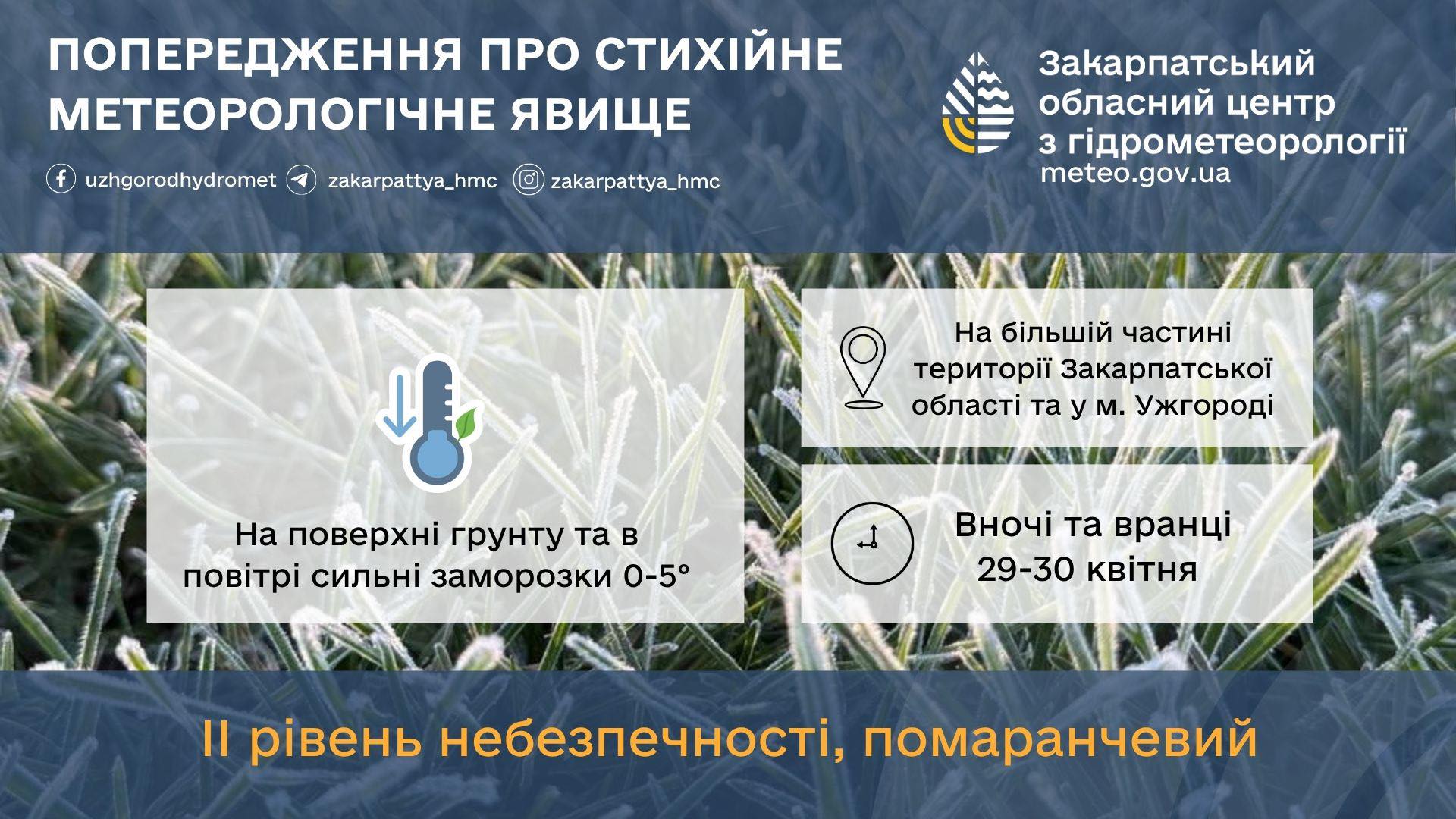 Вночі та вранці 2930 квітня на більшій частині території Закарпатської області та у м. Ужгороді на поверхні грунту та в повітрі очікуються сильні заморозки 0-5°, які будуть шкодочинними для плодово-ягідних культур та винограду (ІІ рівень небезпечності, помаранчевий).