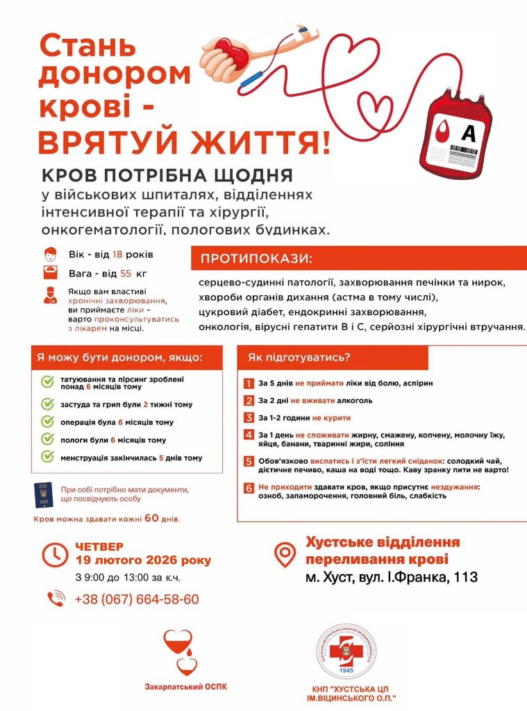 19 лютого з 9:00 до 13:00 у відділенні переливання крові Хустської центральної лікарні відбудеться День донора, присвячений потребам Збройних Сил України. Цей захід проводиться у співпраці із Закарпатською ОСПК.
