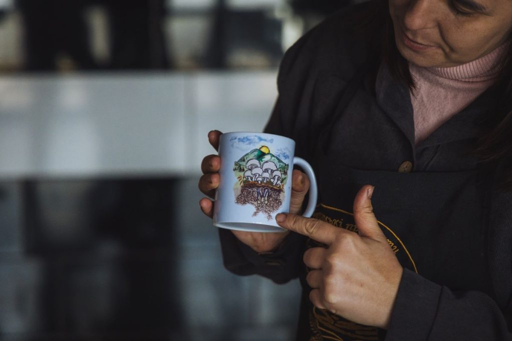 Принагідно показує авторський мерч. На зображенні – гриби на фоні гір, чиє коріння міцне сплетено у герб України: «Бо наша сила – у корінні. Як би нас не намагались вирвати, викрутити, ми все одно проростаємо і живемо».