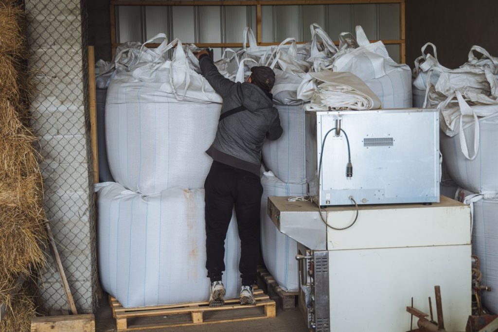 Цього року Юрій з Євгеном уперше засіяли спельту (вид пшениці) і – зібрали 6,5 тонн. Зерно зберігається в ангарі – у тих самих біг-бегах, що їх колись виготовляв завод, де працював Євген. У майбутньому з цього зерна будуть випікати крафтовий хліб у місцевій мініпекарні.
