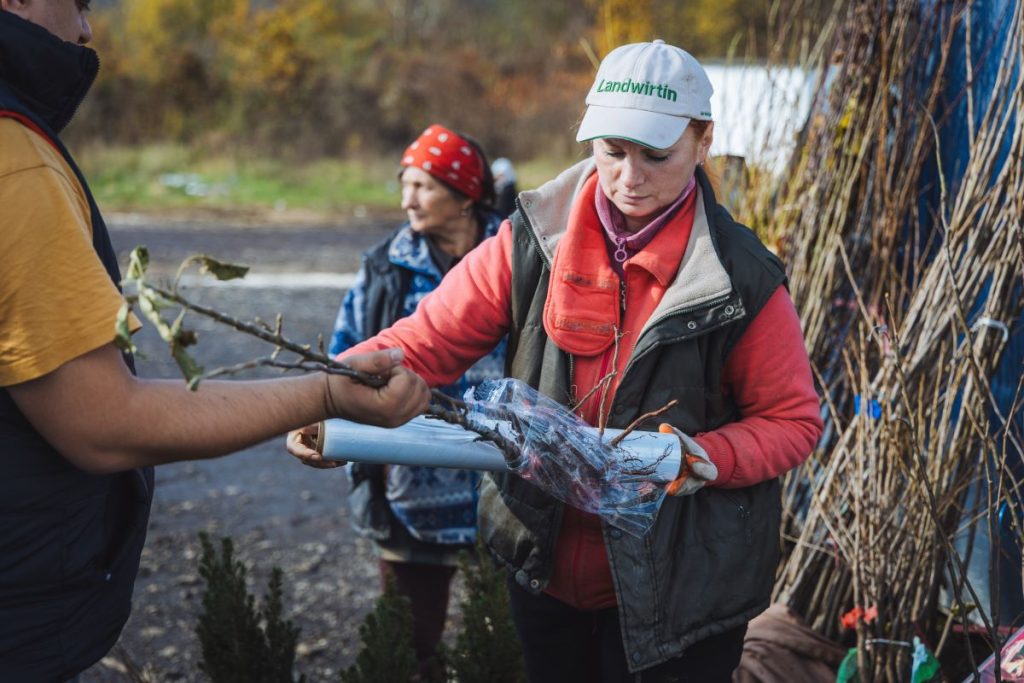 Її досвід – це роки практики й експериментів. Ще на Сумщині жінка тестувала різні сорти, щоб зрозуміти, які найкраще приживаються. Тепер продовжує свою справу на Закарпатті. Зі щепленням саджанців допомагає чоловік, котрий після поранення отримав інвалідність. Також поряд – матір і донька.
