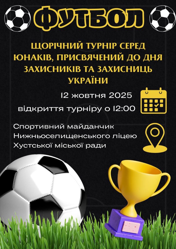 12 жовтня (початок о 12:00) на спортивному майданчику Нижньоселищенського ліцею Хустської міської ради відбудеться щорічний турнір з футболу серед юнаків, присвячений Дню захисників і захисниць України.