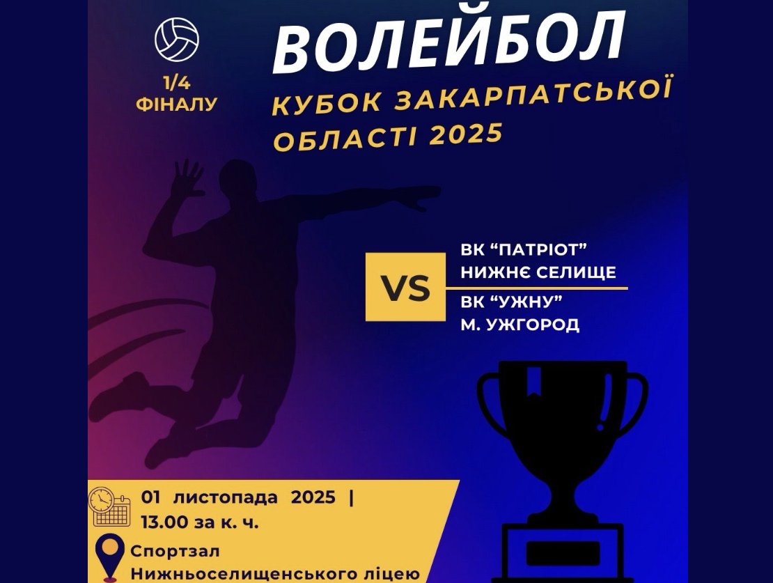 1 листопада о 13:00 у спортивній залі Нижньоселищенського ліцею відбудеться чвертьфінальна гра Кубка Закарпатської області з волейболу.